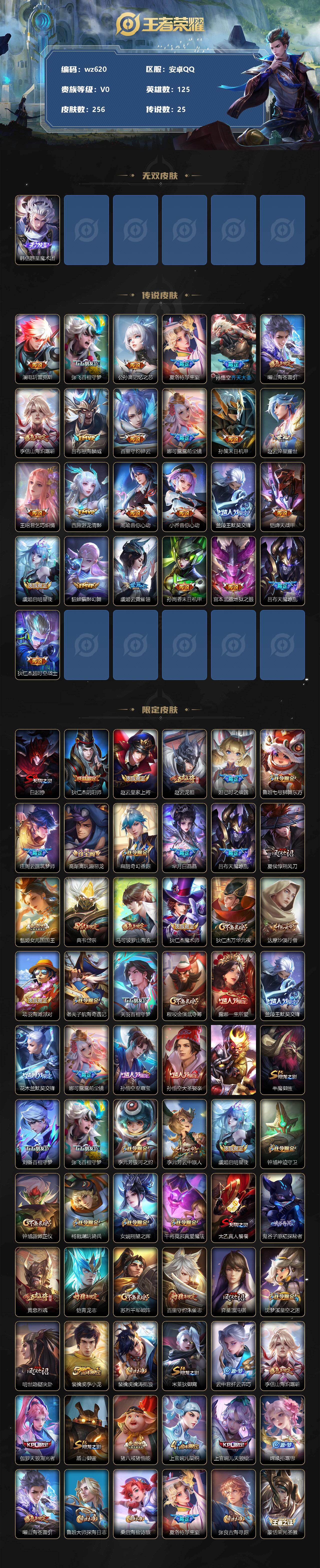 【wz620】【商品标题】:安卓Q-V0-尊贵铂金I段位-125英雄-256皮肤-0典藏-0珍品无双-1无双-0珍品传说-25传说-74史诗 【无双皮肤】:韩信群星魔术团 【传说皮肤】:澜电玩雷克斯,张飞百相守梦,公孙离记忆之芯,夏洛特浮生妄,孙悟空齐天大圣,曜山海苍雷引,李信山海炽霜斩,吕布怒海麟威,百里守约碎云,娜可露露前尘镜,孙策末日机甲,赵云淬星耀世,王昭君乞巧织情,西施游龙清影,周瑜音你心动,小乔音你心动,兰陵王默契交锋,铠绛天战甲,虞姬启明星使,貂蝉猫影幻舞,虞姬云霓雀翎,孙尚香末日机甲,宫本武藏地狱之眼,吕布天魔缭乱,狄仁杰超时空战士 【限定皮肤】:白起狰,狄仁杰阴阳师,赵云皇家上将,赵云龙胆,妲己时之彼端,鲁班七号狮舞东方,庄周云端筑梦师,高渐离玩趣恶龙,扁鹊奇幻香踪,芈月白晶晶,吕布天魔缭乱,夏侯惇朔风刀,甄姬女儿国国王,典韦岱宗,马可波罗山海玄木吟,狄仁杰魔术师,狄仁杰万华元夜,达摩沙漠行僧,项羽海滩派对,老夫子航海奇遇记,关羽百相守梦,程咬金演武夺筹,露娜一生所爱,兰陵王默契交锋,花木兰默契交锋,娜可露露前尘镜,孙悟空至尊宝,孙悟空大圣娶亲,孙悟空齐天大圣,牛魔御旌,刘备百相守梦,张飞百相守梦,李元芳银河之约,李元芳云中旅人,虞姬启明星使,钟馗神迹守卫,钟馗驱傩正仪,杨戬潮玩骑兵,女娲朔望之晖,干将莫邪真爱魔法,太乙真人饕餮,鬼谷子原初探秘者,黄忠烈魂,铠青龙志,苏烈千军破阵,百里守约朱雀志,弈星混沌棋,沈梦溪星空之诺,明世隐疑决卦,裴擒虎李小龙,裴擒虎擒涛扼浪,米莱狄御霄,云中君纤云弄巧,李信山海炽霜斩,伽罗天狼溯光者,盾山御銮,猪八戒猪悟能,上官婉儿梁祝,上官婉儿天狼绘梦者,嫦娥拒霜思,曜山海苍雷引,鲁班大师探海日志,桑启海盐诗旅,夏洛特浮生妄,张良古海寻踪,蒙恬荣光圣徽,高渐离燃音魔法,妲己灵卜魔法,鬼谷子天穹祈灯,沈梦溪龙舞盛年,鲁班七号蔬乡物语,李元芳蔬乡物语,刘邦剑破天穹,上官婉儿群星魔术团,程咬金群星魔术团,韩信群星魔术团,镜青焰无极,项羽苍威无极 【年限皮肤】:百里守约朱雀志,铠青龙志,典韦岱宗,马超神威,黄忠烈魂,赵云龙胆,马可波罗山海玄木吟,李信山海炽霜斩,曜山海苍雷引 【赛季限定】:白起狰,夏侯惇朔风刀,狄仁杰万华元夜,达摩沙漠行僧,程咬金演武夺筹,张良古海寻踪,牛魔御旌,李元芳云中旅人,钟馗驱傩正仪,太乙真人饕餮,鬼谷子原初探秘者,苏烈千军破阵,弈星混沌棋,明世隐疑决卦,裴擒虎擒涛扼浪,米莱狄御霄,盾山御銮,鲁班大师探海日志,桑启海盐诗旅,鬼谷子天穹祈灯,蒙恬荣光圣徽,刘邦剑破天穹 【战令限定】:鲁班七号狮舞东方,扁鹊奇幻香踪,老夫子航海奇遇记,李元芳银河之约,钟馗神迹守卫,杨戬潮玩骑兵,女娲朔望之晖,干将莫邪真爱魔法,沈梦溪星空之诺,高渐离燃音魔法,妲己灵卜魔法,鲁班七号蔬乡物语,李元芳蔬乡物语,镜青焰无极,项羽苍威无极 【史诗皮肤】:赵云皇家上将,貂蝉圣诞恋歌,甄姬冰雪圆舞曲,狄仁杰魔术师,廉颇地狱岩魂,宫本武藏鬼剑武藏,嬴政暗夜贵公子,嬴政摇滚巨星,妲己魅力维加斯,妲己女仆咖啡,墨子龙骑士,墨子金属风暴,刘禅绅士熊喵,曹操幽灵船长,李白千年之狐,张飞乱世虎臣,韩信白龙吟,孙悟空至尊宝,花木兰水晶猎龙者,刘邦德古拉伯爵,夏侯惇乘风破浪,小乔缤纷独角兽,兰陵王暗隐猎兽者,雅典娜冰冠公主,安琪拉心灵骇客,庄周云端筑梦师,李元芳逐浪之夏,程咬金功夫厨神,白起星夜王子,阿轲节奏热浪,铠青龙志,百里守约朱雀志,露娜一生所爱,孙悟空大圣娶亲,鲁班七号狮舞东方,狄仁杰鹰眼统帅,公孙离无限星赏官,上官婉儿梁祝,李元芳银河之约,典韦岱宗,妲己时之彼端,大乔白蛇,不知火舞魅语,橘右京修罗,马超神威,赵云龙胆,黄忠烈魂,上官婉儿天狼绘梦者,裴擒虎李小龙,云中君纤云弄巧,芈月白晶晶,花木兰默契交锋,西施诗语江南,百里玄策热力回旋,老夫子航海奇遇记,伽罗天狼溯光者,干将莫邪真爱魔法,猪八戒猪悟能,嫦娥拒霜思,甄姬女儿国国王,澜赏金猎手,貂蝉唤灵魅影,马可波罗山海玄木吟,扁鹊奇幻香踪,刘备百相守梦,关羽百相守梦,蔡文姬电玩兔顽号,刘禅电玩爆裂旋风,妲己灵卜魔法,高渐离燃音魔法,蒙恬荣光圣徽,鲁班七号蔬乡物语,上官婉儿群星魔术团,镜青焰无极,后羿石田雨龙 【其他皮肤】:项羽海滩派对,韩信教廷特使,韩信街头霸王,露娜哥特玫瑰,达摩大发明家,赵云忍炎影,芈月红桃皇后,白起白色死神,牛魔西部大镖客,扁鹊化身博士,庄周鲤鱼之梦,宫本武藏未来纪元,安琪拉玩偶对对碰,孙膑天使之翼,姜子牙时尚教父,妲己少女阿狸,典韦黄金武士,亚瑟死亡骑士,达摩拳王,花木兰兔女郎,甄姬花好人间,刘备万事如意,宫本武藏万象初新,后羿阿尔法小队,狄仁杰阴阳师,刘备纽约教父,刘备汉昭烈帝,关羽龙腾万里,白起狰,钟无艳海滩丽影,太乙真人饕餮,