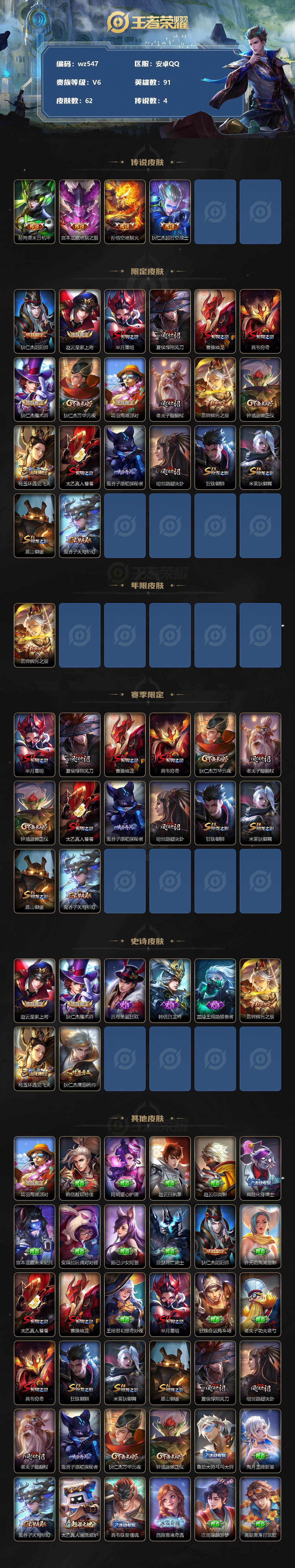 【wz547】【商品标题】:安卓Q-V6-最强王者段位-91英雄-62皮肤-0典藏-0珍品无双-0无双-0珍品传说-4传说-8史诗 【传说皮肤】:孙尚香末日机甲,宫本武藏地狱之眼,孙悟空地狱火,狄仁杰超时空战士 【限定皮肤】:狄仁杰阴阳师,赵云皇家上将,芈月重明,夏侯惇朔风刀,曹操烛龙,典韦穷奇,狄仁杰魔术师,狄仁杰万华元夜,项羽海滩派对,老夫子醍醐杖,后羿辉光之辰,钟馗驱傩正仪,杨玉环遇见飞天,太乙真人饕餮,鬼谷子原初探秘者,明世隐疑决卦,狂铁御狮,米莱狄御霄,盾山御銮,鬼谷子天穹祈灯 【年限皮肤】:后羿辉光之辰 【赛季限定】:芈月重明,夏侯惇朔风刀,曹操烛龙,典韦穷奇,狄仁杰万华元夜,老夫子醍醐杖,钟馗驱傩正仪,太乙真人饕餮,鬼谷子原初探秘者,明世隐疑决卦,狂铁御狮,米莱狄御霄,盾山御銮,鬼谷子天穹祈灯 【史诗皮肤】:赵云皇家上将,狄仁杰魔术师,吕布圣诞狂欢,韩信白龙吟,兰陵王暗隐猎兽者,后羿辉光之辰,杨玉环遇见飞天,狄仁杰鹰眼统帅 【其他皮肤】:项羽海滩派对,韩信教廷特使,阿轲爱心护理,赵云白执事,赵云忍炎影,扁鹊化身博士,宫本武藏未来纪元,安琪拉玩偶对对碰,妲己少女阿狸,亚瑟死亡骑士,狄仁杰阴阳师,钟无艳海滩丽影,太乙真人饕餮,曹操烛龙,王昭君幻想奇妙夜,芈月重明,狂铁命运角斗场,老夫子功夫老勺,典韦穷奇,狂铁御狮,米莱狄御霄,盾山御銮,夏侯惇朔风刀,明世隐疑决卦,老夫子醍醐杖,鬼谷子原初探秘者,狄仁杰万华元夜,钟馗驱傩正仪,鲁班大师乓乓大师,海月王牌新星,鬼谷子天穹祈灯,太乙真人谧流熔炉,典韦铁骨偃魂,西施雪境奇遇,庄周锦麟游梦,高渐离落日弦歌,鲁班七号木偶奇遇记,狄仁杰锦衣卫,孙悟空西部大镖客,妲己仙境爱丽丝,夏侯惇战争骑士,干将莫邪第七人偶,铠龙域领主,百里守约绝影神枪,梦奇美梦成真,公孙离花间舞,裴擒虎街头旋风,元歌午夜歌剧院,伽罗花见巫女,李信灼热之刃 【营地ID】:54279416