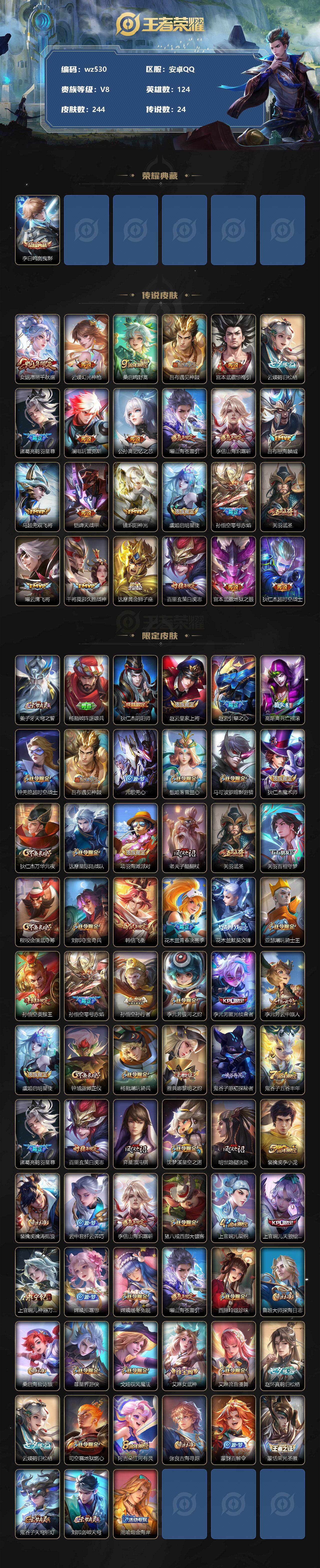 【wz530】【商品标题】:安卓Q-V8-至尊星耀V段位-124英雄-244皮肤-1典藏-0珍品无双-0无双-0珍品传说-24传说-63史诗 【荣耀典藏】:李白鸣剑曳影 【传说皮肤】:女娲愿照千秋盛,云缨幻光神枪,桑启鸣野蒿,吕布遇见神鼓,宫本武藏惊梅引,云缨鹤归松栖,诸葛亮鹤羽星尊,澜电玩雷克斯,公孙离记忆之芯,曜山海苍雷引,李信山海炽霜斩,吕布怒海麟威,马超无双飞将,铠绛天战甲,镜炽阳神光,虞姬启明星使,孙悟空零号赤焰,关羽武圣,曜云鹰飞将,干将莫邪久胜战神,达摩黄金狮子座,百里玄策白虎志,宫本武藏地狱之眼,狄仁杰超时空战士 【限定皮肤】:姜子牙天穹之誓,杨戬破阵退雄兵,狄仁杰阴阳师,赵云皇家上将,赵云引擎之心,高渐离死亡摇滚,钟无艳超时空战士,吕布遇见神鼓,元歌无心,甄姬落雪兰心,马可波罗暗影游猎,狄仁杰魔术师,狄仁杰万华元夜,达摩星际陆战队,项羽海滩派对,老夫子醍醐杖,关羽武圣,关羽百相守梦,程咬金演武夺筹,刘邦夺宝奇兵,韩信飞衡,花木兰青春决赛季,花木兰默契交锋,亚瑟潮玩骑士王,孙悟空美猴王,孙悟空零号赤焰,孙悟空孙行者,李元芳银河之约,李元芳匿光侦查者,李元芳云中旅人,虞姬启明星使,钟馗驱傩正仪,杨戬潮玩骑兵,雅典娜黎明之约,鬼谷子原初探秘者,鬼谷子五谷丰年,诸葛亮鹤羽星尊,百里玄策白虎志,弈星混沌棋,沈梦溪星空之诺,明世隐疑决卦,裴擒虎李小龙,裴擒虎擒涛扼浪,云中君纤云弄巧,李信山海炽霜斩,猪八戒西部大镖客,上官婉儿梁祝,上官婉儿天狼绘梦者,上官婉儿神器万象笔,嫦娥拒霜思,嫦娥暖冬兔眠,曜山海苍雷引,西施玲珑珍味,鲁班大师探海日志,桑启海盐诗旅,暃星界游侠,戈娅驭风魔法,艾琳女武神,艾琳流音漫舞,赵怀真鹤归松栖,云缨鹤归松栖,司空震地狱燃心,阿古朵江河有灵,张良古海寻踪,蒙犽百解令,蒙恬荣光圣徽,鬼谷子天穹祈灯,刘邦剑破天穹,周瑜熔金海岸 【年限皮肤】:百里玄策白虎志,孙悟空美猴王,韩信飞衡,关羽武圣,李信山海炽霜斩,曜山海苍雷引 【赛季限定】:狄仁杰万华元夜,老夫子醍醐杖,程咬金演武夺筹,张良古海寻踪,李元芳云中旅人,钟馗驱傩正仪,雅典娜黎明之约,鬼谷子原初探秘者,弈星混沌棋,明世隐疑决卦,裴擒虎擒涛扼浪,鲁班大师探海日志,桑启海盐诗旅,鬼谷子天穹祈灯,蒙恬荣光圣徽,刘邦剑破天穹,姜子牙天穹之誓 【战令限定】:钟无艳超时空战士,甄姬落雪兰心,马可波罗暗影游猎,达摩星际陆战队,刘邦夺宝奇兵,艾琳流音漫舞,亚瑟潮玩骑士王,李元芳银河之约,杨戬潮玩骑兵,沈梦溪星空之诺,猪八戒西部大镖客,嫦娥暖冬兔眠,西施玲珑珍味,司空震地狱燃心,暃星界游侠,戈娅驭风魔法 【史诗皮肤】:赵云皇家上将,赵云未来纪元,貂蝉圣诞恋歌,甄姬冰雪圆舞曲,王昭君偶像歌手,狄仁杰魔术师,廉颇地狱岩魂,宫本武藏鬼剑武藏,孙尚香水果甜心,嬴政暗夜贵公子,嬴政摇滚巨星,妲己魅力维加斯,墨子龙骑士,墨子金属风暴,吕布圣诞狂欢,刘禅绅士熊喵,张飞乱世虎臣,赵云引擎之心,花木兰水晶猎龙者,夏侯惇乘风破浪,兰陵王暗隐猎兽者,诸葛亮黄金分割率,亚瑟心灵战警,雅典娜冰冠公主,安琪拉心灵骇客,花木兰青春决赛季,铠曙光守护者,李元芳逐浪之夏,程咬金功夫厨神,阿轲节奏热浪,孙策猫狗日记,狄仁杰鹰眼统帅,上官婉儿梁祝,李元芳银河之约,韩信飞衡,橘右京修罗,上官婉儿天狼绘梦者,马可波罗暗影游猎,裴擒虎李小龙,云中君纤云弄巧,花木兰默契交锋,百里玄策热力回旋,孙悟空孙行者,嫦娥拒霜思,雅典娜黎明之约,貂蝉唤灵魅影,钟无艳超时空战士,鬼谷子五谷丰年,上官婉儿神器万象笔,元歌无心,暃星界游侠,关羽百相守梦,刘禅电玩爆裂旋风,戈娅驭风魔法,赵怀真鹤归松栖,李元芳匿光侦查者,司空震地狱燃心,阿古朵江河有灵,蒙犽百解令,蒙恬荣光圣徽,百里守约百相守梦,阿轲化蝶舞,狂铁龙之律动 【其他皮肤】:项羽海滩派对,韩信教廷特使,韩信街头霸王,露娜哥特玫瑰,赵云白执事,赵云忍炎影,芈月红桃皇后,艾琳女武神,白起白色死神,牛魔西部大镖客,武则天东方不败,宫本武藏未来纪元,安琪拉玩偶对对碰,孙膑天使之翼,姜子牙时尚教父,妲己少女阿狸,典韦黄金武士,亚瑟死亡骑士,达摩拳王,孙悟空美猴王,花木兰兔女郎,甄姬花好人间,刘备万事如意,狄仁杰阴阳师,刘备纽约教父,高渐离死亡摇滚,刘备汉昭烈帝,钟无艳海滩丽影,宫本武藏霸王丸,王昭君幻想奇妙夜,狂铁命运角斗场,老夫子功夫老勺,李白敏锐之力,鬼谷子幻乐之宴,苏烈坚韧之力,大乔守护之力,明世隐虹云星官,小乔丁香结,吕布野性能量,沈梦溪鲨炮海盗猫,姜子牙炽热元素使,沈梦溪星空之诺,弈星混沌棋,哪吒次元突破,明世隐疑决卦,刘邦夺宝奇兵,老夫子醍醐杖,猪八戒西部大镖客,狂铁特工战影,鬼谷子原初探秘者,狄仁杰万华元夜,亚瑟潮玩骑士王,刘禅秘密基地,杨戬次元傲视,达摩星际陆战