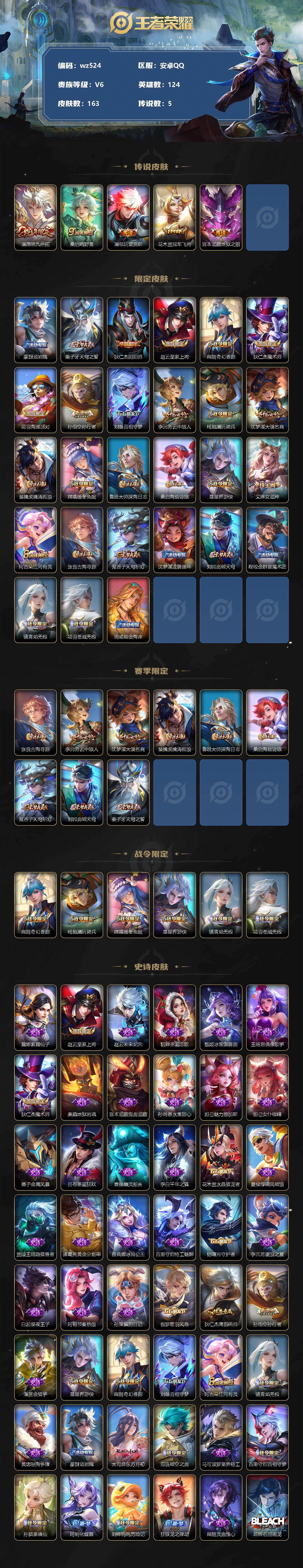 【wz524】【商品标题】:安卓Q-V6-最强王者段位-124英雄-163皮肤-0典藏-0珍品无双-0无双-0珍品传说-5传说-51史诗 【传说皮肤】:澜愿照九州拓,桑启鸣野蒿,澜电玩雷克斯,花木兰冠军飞将,宫本武藏地狱之眼 【限定皮肤】:蒙犽顽岩魄,姜子牙天穹之誓,狄仁杰阴阳师,赵云皇家上将,扁鹊奇幻香踪,狄仁杰魔术师,项羽海滩派对,孙悟空孙行者,刘备百相守梦,李元芳云中旅人,杨戬潮玩骑兵,沈梦溪大漠名商,裴擒虎擒涛扼浪,嫦娥暖冬兔眠,鲁班大师探海日志,桑启海盐诗旅,暃星界游侠,艾琳女武神,阿古朵江河有灵,张良古海寻踪,鬼谷子天穹祈灯,沈梦溪龙舞盛年,刘邦剑破天穹,程咬金群星魔术团,镜青焰无极,项羽苍威无极,周瑜熔金海岸 【赛季限定】:张良古海寻踪,李元芳云中旅人,沈梦溪大漠名商,裴擒虎擒涛扼浪,鲁班大师探海日志,桑启海盐诗旅,鬼谷子天穹祈灯,刘邦剑破天穹,姜子牙天穹之誓 【战令限定】:扁鹊奇幻香踪,杨戬潮玩骑兵,嫦娥暖冬兔眠,暃星界游侠,镜青焰无极,项羽苍威无极 【史诗皮肤】:露娜紫霞仙子,赵云皇家上将,赵云未来纪元,貂蝉圣诞恋歌,甄姬冰雪圆舞曲,王昭君偶像歌手,狄仁杰魔术师,廉颇地狱岩魂,宫本武藏鬼剑武藏,孙尚香水果甜心,妲己魅力维加斯,妲己女仆咖啡,墨子金属风暴,吕布圣诞狂欢,曹操幽灵船长,李白千年之狐,花木兰水晶猎龙者,夏侯惇乘风破浪,兰陵王暗隐猎兽者,诸葛亮黄金分割率,雅典娜冰冠公主,百里守约特工魅影,铠曙光守护者,李元芳逐浪之夏,白起星夜王子,阿轲节奏热浪,孙策猫狗日记,伽罗箭羽风息,狄仁杰鹰眼统帅,孙悟空孙行者,澜赏金猎手,暃星界游侠,扁鹊奇幻香踪,刘备百相守梦,阿古朵江河有灵,镜青焰无极,黄忠怒海争锋,蒙犽顽岩魄,大司命东方月初,亚连破空之剑,马可波罗星界特工,百里守约百相守梦,孙膑茶境仙,阿轲化蝶舞,刘禅鸭鸭历险记,狂铁龙之律动,扁鹊灵蛊蚀心,后羿石田雨龙,周瑜百相守梦,黄忠百相守梦,西施织梦人 【其他皮肤】:项羽海滩派对,韩信教廷特使,韩信街头霸王,赵云忍炎影,艾琳女武神,白起白色死神,牛魔西部大镖客,孙膑天使之翼,姜子牙时尚教父,妲己少女阿狸,典韦黄金武士,亚瑟死亡骑士,花木兰兔女郎,甄姬花好人间,刘备万事如意,后羿阿尔法小队,狄仁杰阴阳师,关羽龙腾万里,钟无艳海滩丽影,王昭君幻想奇妙夜,老夫子功夫老勺,诸葛亮掌控之力,李白敏锐之力,鬼谷子幻乐之宴,明世隐虹云星官,小乔丁香结,吕布野性能量,哪吒次元突破,狂铁特工战影,刘禅秘密基地,鲁班大师乓乓大师,刘禅唤灵魔甲,米莱狄契约魔法,沈梦溪大漠名商,蒙犽胡桃狂想曲,蒙恬蔚蓝守将,李元芳云中旅人,桑启海盐诗旅,嫦娥暖冬兔眠,猪八戒潮玩探月行,牛魔牛运亨通,赵怀真太极少年,裴擒虎擒涛扼浪,杨戬潮玩骑兵,太乙真人劲辣红锅,鲁班大师探海日志,姬小满零食大作战,李元芳妄想特派,张良古海寻踪,钟无艳聚星闪耀,鬼谷子天穹祈灯,廉颇功夫炙烤,沈梦溪龙舞盛年,刘邦剑破天穹,程咬金群星魔术团,项羽苍威无极,姜子牙天穹之誓,周瑜熔金海岸,孙悟空神迹守卫,盘古敬我三分,东皇太一噬灭天穹,亚瑟动物派对,老夫子百相守梦,干将莫邪雾都夜雨,吕布逐霄战戟,苍苍林狼骑,太乙真人谧流熔炉,典韦铁骨偃魂,马超访茗客,西施雪境奇遇,少司缘灵卦秘语,明世隐景韶洛都,戈娅玫蓝誓约,刘备浪漫序章,钟馗虚灵犬护,沈梦溪鸭鸭历险记,苏烈春野闲踪,张良灵野札记,阿古朵布丁狗之约,露娜命运加冕,白起死霸装,甄姬逆浪荇歌,孙策百相守梦,庄周锦麟游梦,莱西奥踏浪烽翎,鬼谷子克喵,曹操超能战警,孙悟空西部大镖客,兰陵王隐刃,李元芳特种部队,马可波罗激情绿茵,杨戬埃及法老,鬼谷子阿摩司公爵,铠龙域领主,百里守约绝影神枪,百里玄策威尼斯狂欢,女娲尼罗河女神,元歌午夜歌剧院,司马懿魇语军师,伽罗花见巫女,李信灼热之刃,曜归虚梦演,蒙犽归虚梦演,澜孤猎,司空震启蛰,云缨赤焰之缨,暃碧珀绯影 【内测皮肤】:艾琳女武神,狂铁特工战影 【营地ID】:1755374289