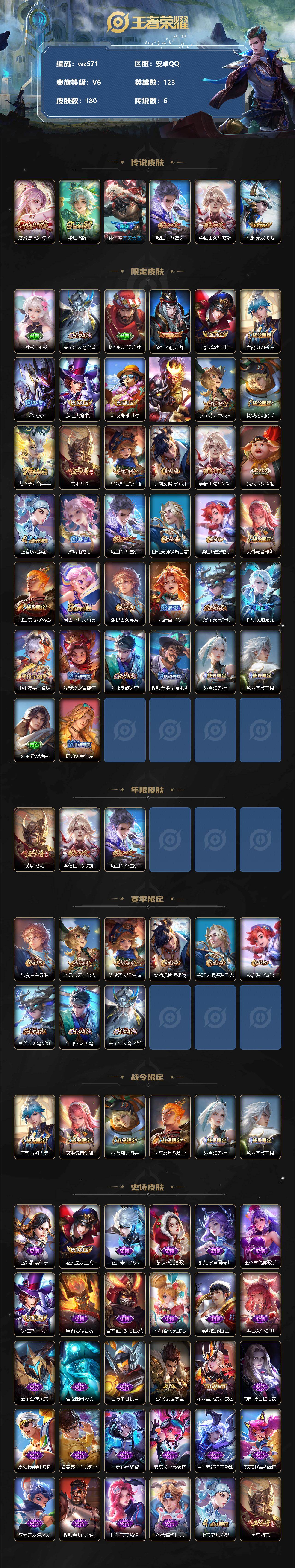 【wz571】【商品标题】:安卓Q-V6-最强王者段位-123英雄-180皮肤-0典藏-0珍品无双-0无双-0珍品传说-6传说-50史诗 【传说皮肤】:虞姬愿照岁时盈,桑启鸣野蒿,孙悟空齐天大圣,曜山海苍雷引,李信山海炽霜斩,马超无双飞将 【限定皮肤】:大乔绒语心约,姜子牙天穹之誓,杨戬破阵退雄兵,狄仁杰阴阳师,赵云皇家上将,扁鹊奇幻香踪,元歌无心,狄仁杰魔术师,项羽海滩派对,孙悟空齐天大圣,李元芳云中旅人,杨戬潮玩骑兵,鬼谷子五谷丰年,黄忠烈魂,沈梦溪大漠名商,裴擒虎擒涛扼浪,李信山海炽霜斩,猪八戒猪悟能,上官婉儿梁祝,嫦娥拒霜思,曜山海苍雷引,鲁班大师探海日志,桑启海盐诗旅,艾琳流音漫舞,司空震地狱燃心,阿古朵江河有灵,张良古海寻踪,蒙犽百解令,鬼谷子天穹祈灯,伽罗琥珀纪元,姬小满妄想食味,沈梦溪龙舞盛年,刘邦剑破天穹,程咬金群星魔术团,镜青焰无极,项羽苍威无极,刘备异域游侠,周瑜熔金海岸 【年限皮肤】:黄忠烈魂,李信山海炽霜斩,曜山海苍雷引 【赛季限定】:张良古海寻踪,李元芳云中旅人,沈梦溪大漠名商,裴擒虎擒涛扼浪,鲁班大师探海日志,桑启海盐诗旅,鬼谷子天穹祈灯,刘邦剑破天穹,姜子牙天穹之誓 【战令限定】:扁鹊奇幻香踪,艾琳流音漫舞,杨戬潮玩骑兵,司空震地狱燃心,镜青焰无极,项羽苍威无极 【史诗皮肤】:露娜紫霞仙子,赵云皇家上将,赵云未来纪元,貂蝉圣诞恋歌,甄姬冰雪圆舞曲,王昭君偶像歌手,狄仁杰魔术师,廉颇地狱岩魂,宫本武藏鬼剑武藏,孙尚香水果甜心,嬴政摇滚巨星,妲己女仆咖啡,墨子金属风暴,曹操幽灵船长,吕布末日机甲,张飞乱世虎臣,花木兰水晶猎龙者,刘邦德古拉伯爵,夏侯惇乘风破浪,诸葛亮黄金分割率,亚瑟心灵战警,安琪拉心灵骇客,百里守约特工魅影,蔡文姬舞动绿茵,李元芳逐浪之夏,程咬金功夫厨神,阿轲节奏热浪,孙策猫狗日记,上官婉儿梁祝,黄忠烈魂,杨戬天秀启明,猪八戒猪悟能,嫦娥拒霜思,鬼谷子五谷丰年,元歌无心,扁鹊奇幻香踪,刘禅电玩爆裂旋风,司空震地狱燃心,阿古朵江河有灵,蒙犽百解令,伽罗琥珀纪元,姬小满妄想食味,镜青焰无极,黄忠怒海争锋,牛魔星界战将,狄仁杰绮世丹青,阿轲化蝶舞,狂铁龙之律动,黄忠百相守梦,西施织梦人 【其他皮肤】:项羽海滩派对,韩信街头霸王,露娜哥特玫瑰,阿轲爱心护理,赵云白执事,赵云忍炎影,白起白色死神,牛魔西部大镖客,武则天东方不败,庄周鲤鱼之梦,孙膑天使之翼,典韦黄金武士,亚瑟死亡骑士,花木兰兔女郎,甄姬花好人间,后羿阿尔法小队,狄仁杰阴阳师,刘备纽约教父,刘备汉昭烈帝,关羽龙腾万里,钟无艳海滩丽影,狂铁命运角斗场,老夫子功夫老勺,孙尚香沉稳之力,诸葛亮掌控之力,李白敏锐之力,大乔守护之力,明世隐虹云星官,小乔丁香结,姜子牙炽热元素使,鲁班七号黑桃队长,盾山圆桌骑士,狂铁特工战影,鲁班大师乓乓大师,典韦铁甲之心,程咬金无双福将,刘邦虎啸剑宗,沈梦溪大漠名商,蒙恬蔚蓝守将,李元芳云中旅人,刘备潮玩造梦师,桑启海盐诗旅,猪八戒潮玩探月行,白起乐园追猎者,赵怀真太极少年,裴擒虎擒涛扼浪,杨戬潮玩骑兵,太乙真人劲辣红锅,莱西奥西部游侠,鲁班大师探海日志,李元芳妄想特派,哪吒热血海滩,艾琳流音漫舞,张良古海寻踪,钟无艳聚星闪耀,亚连破局者,兰陵王幻夜行动,曹操决胜大满贯,后羿完美运算,程咬金暖冬絮语,鬼谷子天穹祈灯,海诺时空谍影,嫦娥漠中幻影,朵莉亚金色潮汐,廉颇功夫炙烤,亚瑟鸿运当头,沈梦溪龙舞盛年,刘邦剑破天穹,盘古经纬探寻者,程咬金群星魔术团,项羽苍威无极,大司命暗都幽影,刘备异域游侠,杨戬破阵退雄兵,貂蝉长夏之忆,姜子牙天穹之誓,周瑜熔金海岸,大乔绒语心约,盘古敬我三分,东皇太一噬灭天穹,干将莫邪雾都夜雨,苍苍林狼骑,太乙真人谧流熔炉,典韦铁骨偃魂,西施雪境奇遇,姜子牙星梦巡礼,东皇太一金福满堂,达摩爆裂喵拳,少司缘灵卦秘语,明世隐景韶洛都,戈娅玫蓝誓约,钟馗虚灵犬护,苏烈春野闲踪,小乔秘证寻踪,张良灵野札记,阿古朵布丁狗之约,露娜命运加冕,雅典娜潮玩士官长,白起死霸装,庄周锦麟游梦,空空儿戏梦巡演,莱西奥踏浪烽翎,鬼谷子克喵,鲁班七号木偶奇遇记,老夫子潮流仙人,狄仁杰锦衣卫,刘禅英喵野望,马可波罗激情绿茵,黄忠芝加哥教父,铠龙域领主,梦奇美梦成真,女娲尼罗河女神,明世隐占星师,公孙离花间舞,弈星踏雪寻梅,米莱狄精准探案法,孙策海之征途,盘古创世神祝,云中君荷鲁斯之眼,澜孤猎,司空震启蛰,云缨赤焰之缨,金蝉前尘,暃碧珀绯影 【内测皮肤】:狂铁特工战影 【营地ID】:1802414873
