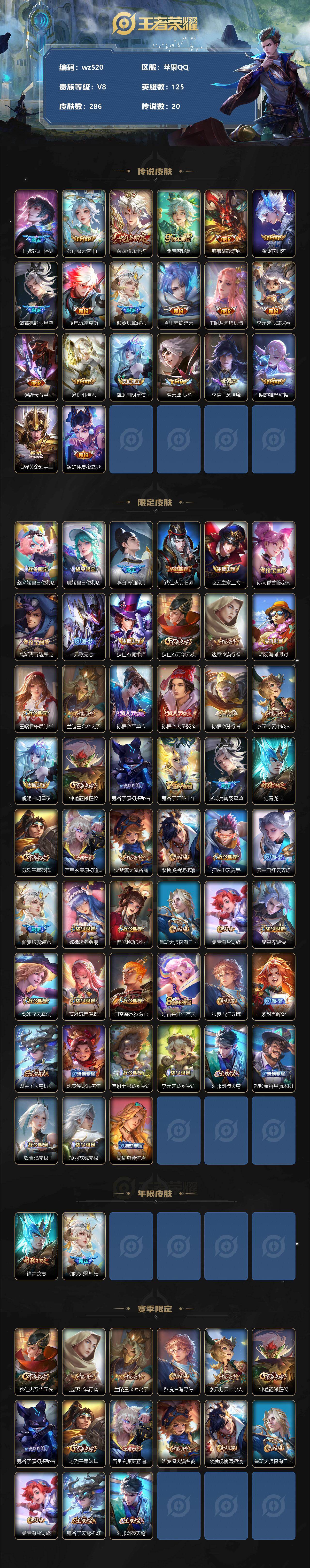 【wz520】【商品标题】:苹果Q-V8-最强王者段位-125英雄-286皮肤-0典藏-0珍品无双-0无双-0珍品传说-20传说-74史诗 【传说皮肤】:司马懿九山相柳,公孙离云诺千山,澜愿照九州拓,桑启鸣野蒿,典韦战鼓燎原,澜逐花归海,诸葛亮鹤羽星尊,澜电玩雷克斯,伽罗炽翼辉光,百里守约碎云,王昭君乞巧织情,李元芳飞鸢探春,铠绛天战甲,镜炽阳神光,虞姬启明星使,曜云鹰飞将,李信一念神魔,貂蝉猫影幻舞,后羿黄金射手座,貂蝉仲夏夜之梦 【限定皮肤】:蔡文姬夏日便利店,虞姬夏日便利店,李白谪仙醉月,狄仁杰阴阳师,赵云皇家上将,孙尚香蔷薇恋人,高渐离玩趣恶龙,元歌无心,狄仁杰魔术师,狄仁杰万华元夜,达摩沙漠行僧,项羽海滩派对,王昭君午后时光,兰陵王金庭之子,孙悟空至尊宝,孙悟空大圣娶亲,孙悟空孙行者,李元芳云中旅人,虞姬启明星使,钟馗驱傩正仪,鬼谷子原初探秘者,鬼谷子五谷丰年,诸葛亮鹤羽星尊,铠青龙志,苏烈千军破阵,百里玄策原初追逐者,沈梦溪大漠名商,裴擒虎擒涛扼浪,狂铁电玩高手,云中君纤云弄巧,伽罗炽翼辉光,嫦娥暖冬兔眠,西施玲珑珍味,鲁班大师探海日志,桑启海盐诗旅,暃星界游侠,戈娅驭风魔法,艾琳流音漫舞,司空震地狱燃心,阿古朵江河有灵,张良古海寻踪,蒙犽百解令,鬼谷子天穹祈灯,沈梦溪龙舞盛年,鲁班七号蔬乡物语,李元芳蔬乡物语,刘邦剑破天穹,程咬金群星魔术团,镜青焰无极,项羽苍威无极,周瑜熔金海岸 【年限皮肤】:铠青龙志,伽罗炽翼辉光 【赛季限定】:狄仁杰万华元夜,达摩沙漠行僧,兰陵王金庭之子,张良古海寻踪,李元芳云中旅人,钟馗驱傩正仪,鬼谷子原初探秘者,苏烈千军破阵,百里玄策原初追逐者,沈梦溪大漠名商,裴擒虎擒涛扼浪,鲁班大师探海日志,桑启海盐诗旅,鬼谷子天穹祈灯,刘邦剑破天穹 【战令限定】:蔡文姬夏日便利店,虞姬夏日便利店,王昭君午后时光,艾琳流音漫舞,狂铁电玩高手,嫦娥暖冬兔眠,西施玲珑珍味,司空震地狱燃心,暃星界游侠,戈娅驭风魔法,鲁班七号蔬乡物语,李元芳蔬乡物语,镜青焰无极,项羽苍威无极 【史诗皮肤】:项羽苍穹之光,露娜紫霞仙子,阿轲暗夜猫娘,赵云皇家上将,赵云未来纪元,貂蝉圣诞恋歌,甄姬冰雪圆舞曲,王昭君偶像歌手,狄仁杰魔术师,廉颇地狱岩魂,宫本武藏鬼剑武藏,孙尚香蔷薇恋人,孙尚香水果甜心,嬴政摇滚巨星,妲己魅力维加斯,妲己女仆咖啡,墨子龙骑士,墨子金属风暴,刘禅绅士熊喵,曹操幽灵船长,李白千年之狐,吕布末日机甲,张飞乱世虎臣,孙悟空至尊宝,花木兰水晶猎龙者,刘邦德古拉伯爵,亚瑟心灵战警,百里守约特工魅影,铠曙光守护者,蔡文姬舞动绿茵,刘禅天才门将,李元芳逐浪之夏,程咬金功夫厨神,白起星夜王子,阿轲节奏热浪,孙策猫狗日记,铠青龙志,孙悟空大圣娶亲,狄仁杰鹰眼统帅,公孙离无限星赏官,娜可露露晚萤,不知火舞魅语,橘右京修罗,孙尚香时之恋人,百里玄策原初追逐者,云中君纤云弄巧,百里玄策热力回旋,杨戬天秀启明,孙悟空孙行者,澜赏金猎手,貂蝉唤灵魅影,狂铁电玩高手,鬼谷子五谷丰年,元歌无心,暃星界游侠,戈娅驭风魔法,百里守约真我赫兹,司空震地狱燃心,阿古朵江河有灵,蒙犽百解令,鲁班七号蔬乡物语,镜青焰无极,蔡文姬夏日便利店,亚连破空之剑,马可波罗星界特工,李白谪仙醉月,弈星万物之道,狄仁杰绮世丹青,阿轲化蝶舞,刘禅鸭鸭历险记,狂铁龙之律动,百里守约雪豹霜爪,黄忠百相守梦,公孙离涂山容容 【其他皮肤】:项羽海滩派对,韩信教廷特使,韩信街头霸王,露娜哥特玫瑰,阿轲爱心护理,达摩大发明家,赵云白执事,赵云忍炎影,芈月红桃皇后,程咬金星际陆战队,白起白色死神,扁鹊化身博士,扁鹊救世之瞳,宫本武藏未来纪元,安琪拉玩偶对对碰,孙膑天使之翼,姜子牙时尚教父,妲己少女阿狸,典韦黄金武士,亚瑟死亡骑士,花木兰兔女郎,张飞五福同心,甄姬花好人间,刘备万事如意,宫本武藏万象初新,后羿阿尔法小队,狄仁杰阴阳师,刘备纽约教父,刘备汉昭烈帝,关羽龙腾万里,墨子进击墨子号,钟无艳海滩丽影,王昭君幻想奇妙夜,狂铁命运角斗场,老夫子功夫老勺,孙尚香沉稳之力,诸葛亮掌控之力,李白敏锐之力,鬼谷子幻乐之宴,苏烈坚韧之力,大乔守护之力,明世隐虹云星官,小乔丁香结,吕布野性能量,孙膑归虚梦演,高渐离玩趣恶龙,姜子牙炽热元素使,哪吒次元突破,盾山圆桌骑士,狂铁特工战影,鬼谷子原初探秘者,狄仁杰万华元夜,刘禅秘密基地,露娜瓷语鉴心,张良缤纷绘卷,盘古重装意志,钟馗驱傩正仪,鲁班大师乓乓大师,苏烈千军破阵,典韦铁甲之心,达摩沙漠行僧,兰陵王金庭之子,王昭君午后时光,沈梦溪大漠名商,蒙犽胡桃狂想曲,蒙恬蔚蓝守将,李元芳云中旅人,戈娅危途狂花,刘备潮玩造梦师,桑启海盐诗旅,嫦娥暖冬兔眠,海月幻泉雾影,牛魔牛运亨通,白起乐园追猎者,赵怀真太极少年,裴擒虎擒涛扼浪,太乙真人劲辣红