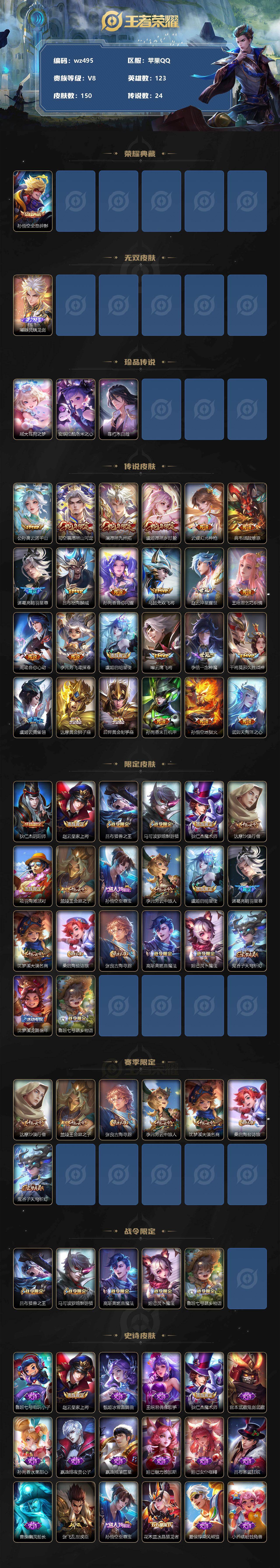 【wz495】【商品标题】:苹果Q-V8-最强王者段位-123英雄-150皮肤-1典藏-0珍品无双-1无双-3珍品传说-24传说-43史诗 【荣耀典藏】:孙悟空全息碎影 【无双皮肤】:曜器灵螭龙剑 【珍品传说】:瑶大耳狗之梦,安琪拉酷洛米之心,暃朽木白哉 【传说皮肤】:公孙离云诺千山,司空震愿照山河定,澜愿照九州拓,虞姬愿照岁时盈,云缨幻光神枪,典韦战鼓燎原,诸葛亮鹤羽星尊,吕布怒海麟威,孙尚香音你闪耀,马超无双飞将,赵云淬星耀世,王昭君乞巧织情,周瑜音你心动,李元芳飞鸢探春,虞姬启明星使,曜云鹰飞将,李信一念神魔,干将莫邪久胜战神,虞姬云霓雀翎,达摩黄金狮子座,后羿黄金射手座,孙尚香末日机甲,孙悟空地狱火,武则天海洋之心 【限定皮肤】:狄仁杰阴阳师,赵云皇家上将,吕布猎兽之王,马可波罗暗影游猎,狄仁杰魔术师,达摩沙漠行僧,项羽海滩派对,兰陵王金庭之子,孙悟空至尊宝,李元芳云中旅人,虞姬启明星使,诸葛亮鹤羽星尊,沈梦溪大漠名商,桑启海盐诗旅,张良古海寻踪,高渐离燃音魔法,妲己灵卜魔法,鬼谷子天穹祈灯,沈梦溪龙舞盛年,鲁班七号蔬乡物语 【赛季限定】:达摩沙漠行僧,兰陵王金庭之子,张良古海寻踪,李元芳云中旅人,沈梦溪大漠名商,桑启海盐诗旅,鬼谷子天穹祈灯 【战令限定】:吕布猎兽之王,马可波罗暗影游猎,高渐离燃音魔法,妲己灵卜魔法,鲁班七号蔬乡物语 【史诗皮肤】:鲁班七号电玩小子,赵云皇家上将,甄姬冰雪圆舞曲,王昭君偶像歌手,狄仁杰魔术师,宫本武藏鬼剑武藏,孙尚香水果甜心,嬴政暗夜贵公子,嬴政摇滚巨星,妲己魅力维加斯,妲己女仆咖啡,吕布圣诞狂欢,曹操幽灵船长,张飞乱世虎臣,孙悟空至尊宝,花木兰水晶猎龙者,夏侯惇乘风破浪,小乔缤纷独角兽,兰陵王暗隐猎兽者,百里守约特工魅影,铠曙光守护者,孙策猫狗日记,狄仁杰鹰眼统帅,公孙离无限星赏官,娜可露露晚萤,不知火舞魅语,孙尚香时之恋人,马可波罗暗影游猎,杨戬天秀启明,夏洛特永昼,艾琳奇遇舞章,妲己灵卜魔法,高渐离燃音魔法,鲁班七号蔬乡物语,孙膑茶境仙,苍狼魂孤将,芈月瑰影绮梦,阿轲化蝶舞,刘禅鸭鸭历险记,狂铁龙之律动,百里守约雪豹霜爪,老夫子藏狐褐绒,黄忠百相守梦,公孙离涂山容容 【其他皮肤】:项羽海滩派对,韩信教廷特使,韩信街头霸王,露娜哥特玫瑰,赵云白执事,赵云忍炎影,白起白色死神,扁鹊化身博士,妲己少女阿狸,典韦黄金武士,亚瑟死亡骑士,达摩拳王,花木兰兔女郎,张飞五福同心,狄仁杰阴阳师,刘备纽约教父,关羽龙腾万里,钟无艳海滩丽影,诸葛亮掌控之力,大乔守护之力,吕布猎兽之王,吕布野性能量,哪吒次元突破,狂铁特工战影,廉颇无尽征程,马可波罗潮玩牛仔,达摩沙漠行僧,程咬金无双福将,兰陵王金庭之子,沈梦溪大漠名商,蒙犽胡桃狂想曲,李元芳云中旅人,桑启海盐诗旅,张良古海寻踪,后羿完美运算,鬼谷子天穹祈灯,妲己灵卜魔法,亚瑟鸿运当头,沈梦溪龙舞盛年,盘古经纬探寻者,太乙真人谧流熔炉,马超访茗客,姜子牙星梦巡礼,明世隐景韶洛都,戈娅玫蓝誓约,刘备浪漫序章,钟馗虚灵犬护,沈梦溪鸭鸭历险记,苏烈春野闲踪,小乔秘证寻踪,张良灵野札记,阿古朵布丁狗之约,露娜命运加冕,雅典娜潮玩士官长,姬小满小满鸭,白起死霸装,甄姬逆浪荇歌,空空儿戏梦巡演,高渐离落日弦歌,莱西奥踏浪烽翎,貂蝉异域舞娘,孙悟空西部大镖客,李元芳特种部队,夏侯惇战争骑士,马可波罗激情绿茵,杨戬埃及法老,黄忠芝加哥教父,干将莫邪第七人偶,公孙离花间舞,裴擒虎街头旋风,孙策海之征途,司马懿魇语军师,伽罗花见巫女,李信灼热之刃,猪八戒年年有余,曜归虚梦演,马超幸存者,暃碧珀绯影 【内测皮肤】:狂铁特工战影 【营地ID】:1810436372