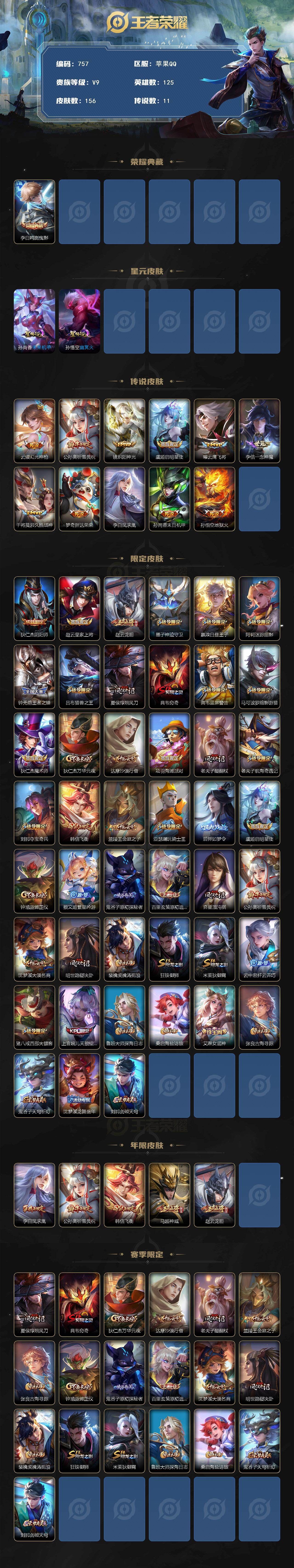 R50396 可二次苹果Q【营地:377237022】-V9-尊贵铂金II段位-125英雄-156皮肤-1典藏皮肤-11传说-35史诗【荣耀典藏】:李白鸣剑曳影【传说皮肤】:云缨幻光神枪,公孙离祈雪灵祝,镜炽阳神光,虞姬启明星使,曜云鹰飞将,李信一念神魔,干将莫邪久胜战神,梦奇胖达荣荣,李白凤求凰,孙尚香末日机甲,孙悟空地狱火【限定皮肤】:狄仁杰阴阳师,赵云皇家上将,赵云龙胆,墨子神迹守卫,嬴政白昼王子,阿轲迷踪丽影,钟无艳王者之锤,吕布猎兽之王,夏侯惇朔风刀,典韦穷奇,典韦蓝屏警告,马可波罗暗影游猎,狄仁杰魔术师,狄仁杰万华元夜,达摩沙漠行僧,项羽海滩派对,老夫子醍醐杖,老夫子航海奇遇记,刘邦夺宝奇兵,韩信飞衡,兰陵王金庭之子,亚瑟潮玩骑士王,后羿如梦令,虞姬启明星使,钟馗驱傩正仪,蔡文姬繁星吟游,鬼谷子原初探秘者,百里玄策原初追逐者,弈星混沌棋,公孙离祈雪灵祝,沈梦溪大漠名商,明世隐疑决卦,裴擒虎擒涛扼浪,狂铁御狮,米莱狄御霄,云中君纤云弄巧,猪八戒西部大镖客,上官婉儿天狼绘梦者,鲁班大师探海日志,桑启海盐诗旅,艾琳女武神,张良古海寻踪,鬼谷子天穹祈灯,沈梦溪龙舞盛年,刘邦剑破天穹【年限皮肤】:李白凤求凰,公孙离祈雪灵祝,韩信飞衡,马超神威,赵云龙胆,各种道具详情看截图、低价出售找回包 赔、截图展示段位不代 表实际段位,如赛季更新等不可抗拒因素发生变化、时限道具不保证所剩时间、标题未写送点劵默认不送【卖号买号首选亿梦】