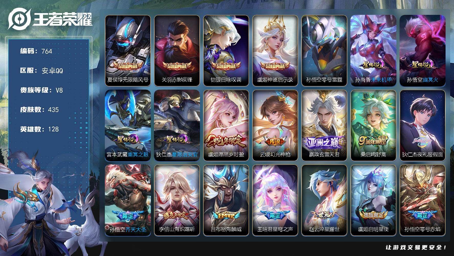 r50417 可二次安卓Q-V8-永恒钻石II段位-128英雄-435皮肤-4典藏皮肤-20传说-130史诗【英雄全皮】:嬴政全皮,阿轲全皮,扁鹊全皮,刘邦全皮,孙权全皮,钟馗全皮,太乙真人全皮,猪八戒全皮,戈娅全皮,空空儿全皮,影全皮【荣耀典藏】:夏侯惇无限飓风号,关羽赤影疾锋,铠银白咏叹调,虞姬神鉴启示录【营地ID】:475162093【金标】:金标东皇太一,金标牛魔,金标艾琳,金标盾山,金标黄忠【星元皮肤】:孙悟空幽冥火,孙尚香未来机甲,狄仁杰星际治安官,宫本武藏幽冥之眼,孙悟空零号雷霆【传说皮肤】:虞姬愿照岁时盈,云缨幻光神枪,嬴政玄雷天君,桑启鸣野蒿,狄仁杰夜礼服假面,孙悟空齐天大圣,李信山海炽霜斩,吕布怒海麟威,王昭君星穹之声,赵云淬星耀世,虞姬启明星使,孙悟空零号赤焰,张良黄金白羊座,干将莫邪久胜战神,虞姬云霓雀翎,后羿黄金射手座,孙尚香末日机甲,宫本武藏地狱之眼,孙悟空地狱火,狄仁杰超时空战士【限定皮肤】:白起狰,大乔绒语心约,姜子牙天穹之誓,杨戬破阵退雄兵,狄仁杰阴阳师,虞姬凯尔特女王,赵云皇家上将,赵云引擎之心,墨子神迹守卫,嬴政优雅恋人,嬴政白昼王子,鲁班七号狮舞东方,庄周高山流水,高渐离死亡摇滚,高渐离玩趣恶龙,阿轲迷踪丽影,钟无艳王者之锤,钟无艳超时空战士,扁鹊炼金王,扁鹊奇幻香踪,芈月重明,芈月幻夜卜梦,吕布猎兽之王,吕布御风骁将,周瑜赤莲之焰,元歌云间偶戏,元歌无心,夏侯惇朔风刀,甄姬游园惊梦,甄姬落雪兰心,曹操烛龙,典韦穷奇,典韦蓝屏警告,典韦岱宗,马可波罗逐梦之星,马可波罗暗影游猎,马可波罗山海玄木吟,狄仁杰魔术师,狄仁杰万华元夜,达摩星际陆战队,达摩沙漠行僧,项羽海滩派对,老夫子醍醐杖,老夫子航海奇遇记,关羽冰锋战神,关羽百相守梦,程咬金演武夺筹,刘邦夺宝奇兵,韩信飞衡,王昭君星穹之声,兰陵王驯魔猎人,兰陵王金庭之子,亚瑟潮玩骑士王,孙悟空至尊宝,孙悟空零号赤焰,孙悟空孙行者,孙悟空齐天大圣,牛魔御旌,后羿辉光之辰,后羿圣弓游侠,刘备百相守梦,李元芳银河之约,李元芳云中旅人,虞姬启明星使,钟馗神迹守卫,钟馗驱傩正仪,杨玉环遇见飞天,杨戬潮玩骑兵,女娲朔望之晖,干将莫邪真爱魔法,雅典娜单词大作战,雅典娜黎明之约,蔡文姬繁星吟游,太乙真人饕餮,太乙真人华丽摇滚,鬼谷子原初探秘者,鬼谷子五谷丰年,黄忠火炮绅士,铠青龙志,苏烈千军破阵,百里玄策原初追逐者,百里守约朱雀志,弈星混沌棋,梦奇顽趣,沈梦溪星空之诺,沈梦溪大漠名商,明世隐疑决卦,裴擒虎天狼狩猎者,裴擒虎李小龙,裴擒虎擒涛扼浪,狂铁御狮,米莱狄御霄,米莱狄胡桃异想国,云中君纤云弄巧,李信山海炽霜斩,伽罗天狼溯光者,盾山御銮,猪八戒西部大镖客,猪八戒猪悟能,上官婉儿梁祝,嫦娥拒霜思,嫦娥暖冬兔眠,西施玲珑珍味,蒙犽狂想玩偶喵,鲁班大师探海日志,桑启海盐诗旅,暃星界游侠,戈娅驭风魔法,艾琳女武神,艾琳流音漫舞,司空震地狱燃心,阿古朵江河有灵,张良古海寻踪,狄仁杰夜礼服假面,蒙犽百解令,蒙恬荣光圣徽,高渐离燃音魔法,妲己灵卜魔法,鬼谷子天穹祈灯,姬小满妄想食味,沈梦溪龙舞盛年,刘邦剑破天穹,程咬金群星魔术团,关羽决胜骁骑,镜青焰无极,项羽苍威无极,刘备异域游侠,芈月浮光幕影,周瑜熔金海岸【年限皮肤】:百里守约朱雀志,铠青龙志,后羿辉光之辰,吕布御风骁将,韩信飞衡,典韦岱宗,马可波罗山海玄木吟,李信山海炽霜斩,各种道具详情看截图、低价出售找回包 赔、截图展示段位不代 表实际段位,如赛季更新等不可抗拒因素发生变化、时限道具不保证所剩时间、标题未写送点劵默认不送【卖号买号首选亿梦】