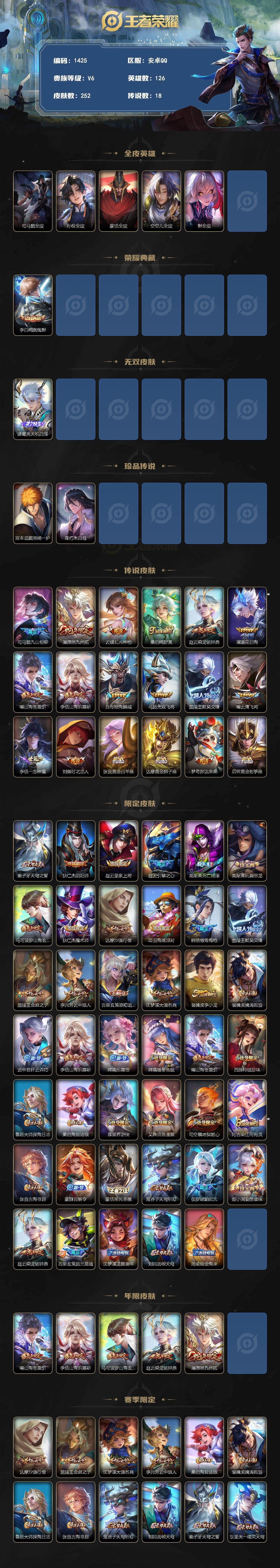 可二次QQ 安卓Q-V6-最强王者段位-126英雄-252皮肤-1典藏皮肤-1无双-2珍品传说-18传说-70史诗【英雄全皮】:司马懿全皮,孙权全皮,蒙恬全皮,空空儿全皮,影全皮【荣耀典藏】:李白鸣剑曳影【无双皮肤】:诸葛亮天机白泽【珍品传说】:宫本武藏黑崎一护,暃朽木白哉【传说皮肤】:司马懿九山相柳,澜愿照九州拓,云缨幻光神枪,桑启鸣野蒿,赵云乘龙铭钟鼎,澜逐花归海,曜山海苍雷引,李信山海炽霜斩,吕布怒海麟威,马超无双飞将,兰陵王默契交锋,曜云鹰飞将,李信一念神魔,刘备时之恋人,张良黄金白羊座,达摩黄金狮子座,梦奇胖达荣荣,后羿黄金射手座【限定皮肤】:姜子牙天穹之誓,狄仁杰阴阳师,赵云皇家上将,赵云引擎之心,高渐离死亡摇滚,高渐离玩趣恶龙,马可波罗山海玄木吟,狄仁杰魔术师,达摩沙漠行僧,项羽海滩派对,韩信傲雪梅枪,兰陵王默契交锋,兰陵王金庭之子,李元芳云中旅人,百里玄策原初追逐者,沈梦溪大漠名商,裴擒虎李小龙,裴擒虎擒涛扼浪,云中君纤云弄巧,李信山海炽霜斩,嫦娥拒霜思,嫦娥暖冬兔眠,曜山海苍雷引,西施玲珑珍味,鲁班大师探海日志,桑启海盐诗旅,暃星界游侠,艾琳流音漫舞,司空震地狱燃心,阿古朵江河有灵,张良古海寻踪,蒙犽百解令,蒙恬荣光圣徽,鬼谷子天穹祈灯,伽罗琥珀纪元,姬小满妄想食味,赵云乘龙铭钟鼎,百里玄策超元猎域,沈梦溪龙舞盛年,刘邦剑破天穹,周瑜熔金海岸【年限皮肤】:曜山海苍雷引,李信山海炽霜斩,马可波罗山海玄木吟,赵云乘龙铭钟鼎,澜愿照九州拓【赛季限定】:达摩沙漠行僧,兰陵王金庭之子,沈梦溪大漠名商,李元芳云中旅人,桑启海盐诗旅,裴擒虎擒涛扼浪,鲁班大师探海日志,张良古海寻踪,鬼谷子天穹祈灯,刘邦剑破天穹,姜子牙天穹之誓,东皇太一噬灭天穹,太乙真人谧流熔炉,钟馗虚灵犬护,甄姬逆浪荇歌,亚瑟荣光之誓,百里玄策原初追逐者,蒙恬荣光圣徽,牛魔星界战将,项羽九幽镇关【战令限定】:暃星界游侠,嫦娥暖冬兔眠,西施玲珑珍味,司空震地狱燃心,艾琳流音漫舞,亚连破空之剑,孙悟空神迹守卫,百里守约百相守梦,老夫子百相守梦,孙膑茶境仙,马超访茗客,周瑜百相守梦,孙策百相守梦,周瑜线条小狗,小乔线条小狗【史诗皮肤】:周瑜线条小狗,小乔线条小狗,项羽九幽镇关,少司缘巫礼祀神,女娲万灵启世,公孙离涂山容容,黄忠百相守梦,云缨赞萌露比,周瑜百相守梦,后羿石田雨龙,老夫子藏狐褐绒,狂铁龙之律动,阿轲化蝶舞,孙膑茶境仙,牛魔星界战将,百里守约百相守梦,亚连破空之剑,百里玄策超元猎域,姬小满妄想食味,伽罗琥珀纪元,蒙恬荣光圣徽,蒙犽百解令,阿古朵江河有灵,司空震地狱燃心,刘禅电玩爆裂旋风,镜玫瑰异探,马可波罗山海玄木吟,暃星界游侠,澜赏金猎手,韩信傲雪梅枪,嫦娥拒霜思,司马懿暗渊魔法,云中君纤云弄巧,裴擒虎李小龙,百里玄策原初追逐者,孙尚香时之恋人,橘右京修罗,不知火舞魅语,狄仁杰鹰眼统帅,伽罗箭羽风息,大乔猫狗日记,孙策猫狗日记,阿轲节奏热浪,白起星夜王子,李元芳逐浪之夏,蔡文姬舞动绿茵,百里守约特工魅影,雅典娜冰冠公主,亚瑟心灵战警,诸葛亮黄金分割率,夏侯惇乘风破浪,刘邦德古拉伯爵,花木兰水晶猎龙者,赵云引擎之心,张飞乱世虎臣,吕布末日机甲,李白千年之狐,刘禅绅士熊喵,墨子金属风暴,妲己女仆咖啡,妲己魅力维加斯,嬴政摇滚巨星,嬴政暗夜贵公子,孙尚香水果甜心,宫本武藏鬼剑武藏,狄仁杰魔术师,王昭君偶像歌手,甄姬冰雪圆舞曲,貂蝉圣诞恋歌,赵云皇家上将,露娜紫霞仙子,【营地ID】:1828179942,各种道具详情看截图、低价出售找回包 赔、截图展示段位不代 表实际段位,如赛季更新等不可抗拒因素发生变化、时限道具不保证所剩时间、标题未写送点劵默认不送【卖号买号首选亿梦】